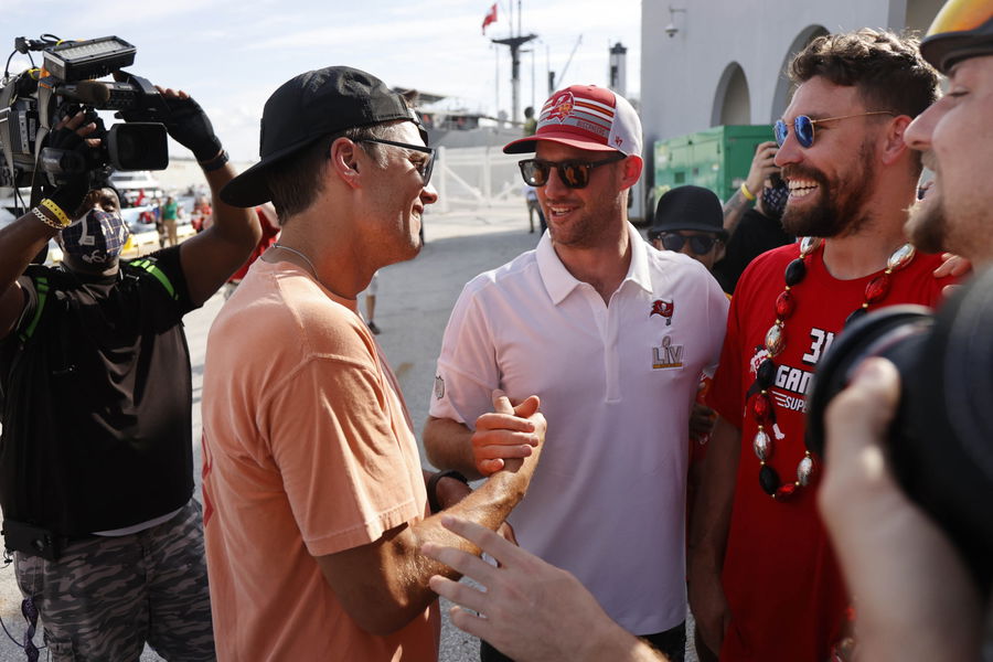 Feb 10, 2021; Tampa Bay, FL, USA; Tampa Bay Buccaneers quarterback Tom Brady (left), quarterback Ryan Griffin (middle) and tight end Cameron Brate (right) after a boat parade to celebrate victory in Super Bowl LV against the Kansas City Chiefs. Mandatory Credit: Kim Klement-USA TODAY Sports