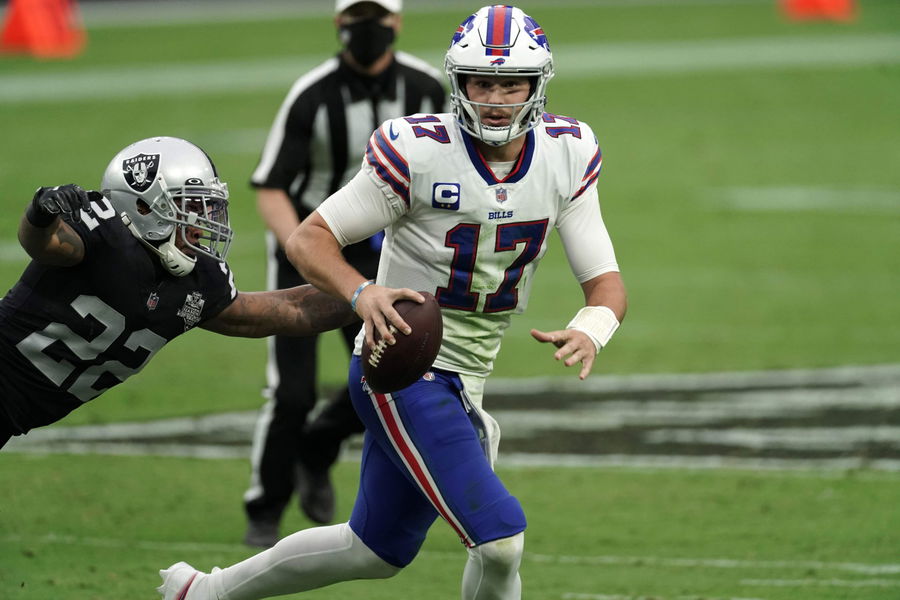 Oct 4, 2020; Paradise, Nevada, USA; Buffalo Bills quarterback Josh Allen (17) throws the ball under pressure from Las Vegas Raiders cornerback Keisean Nixon (22) in the second quarter at Allegiant Stadium. Mandatory Credit: Kirby Lee-USA TODAY Sports