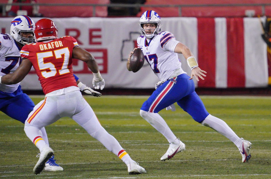 Jan 24, 2021; Kansas City, MO, USA; Buffalo Bills quarterback Josh Allen (17) looks to pass against the Kansas City Chiefs during the second quarter in the AFC Championship Game at Arrowhead Stadium. Mandatory Credit: Denny Medley-USA TODAY Sports