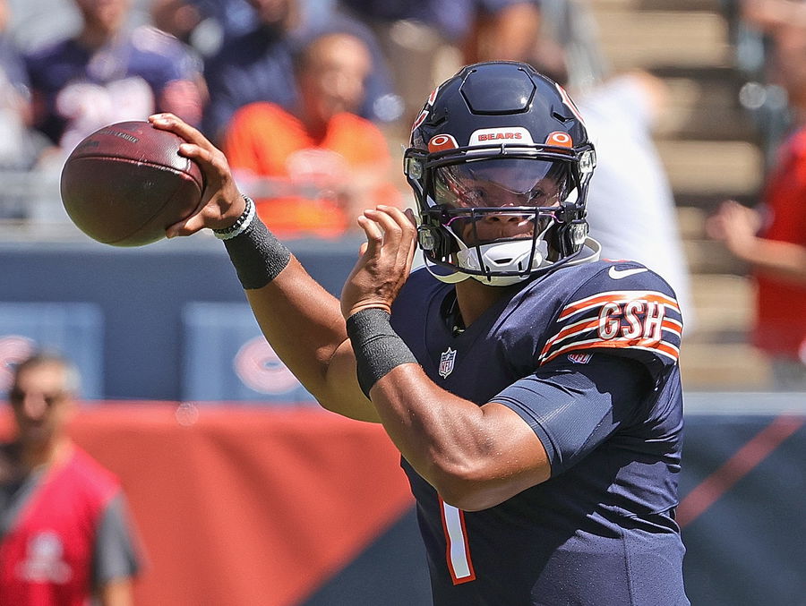 CHICAGO, ILLINOIS – AUGUST 14: Justin Fields #1 of the Chicago Bears passes against the Miami Dolphins during a preseason game at Soldier Field on August 14, 2021 in Chicago, Illinois. (Photo by Jonathan Daniel/Getty Images)