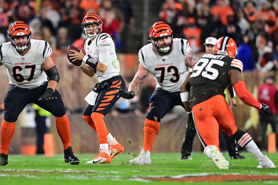 Oct 31, 2022; Cleveland, Ohio, USA; Cincinnati Bengals quarterback Joe Burrow (9) looks to pass in the first quarter against the Cleveland Browns at FirstEnergy Stadium. Mandatory Credit: David Dermer-USA TODAY Sports