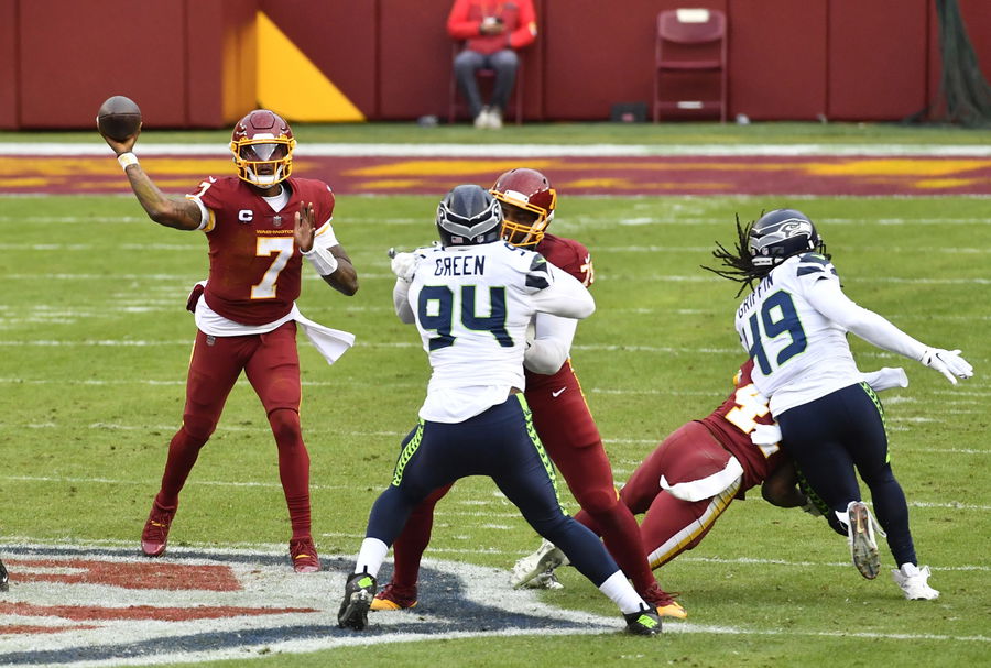 Dec 20, 2020; Landover, Maryland, USA; Washington Football Team quarterback Dwayne Haskins Jr. (7) attempts a pass as Seattle Seahawks defensive end Damontre’ Moore (99) defends during the second half at FedExField. Mandatory Credit: Brad Mills-USA TODAY Sports