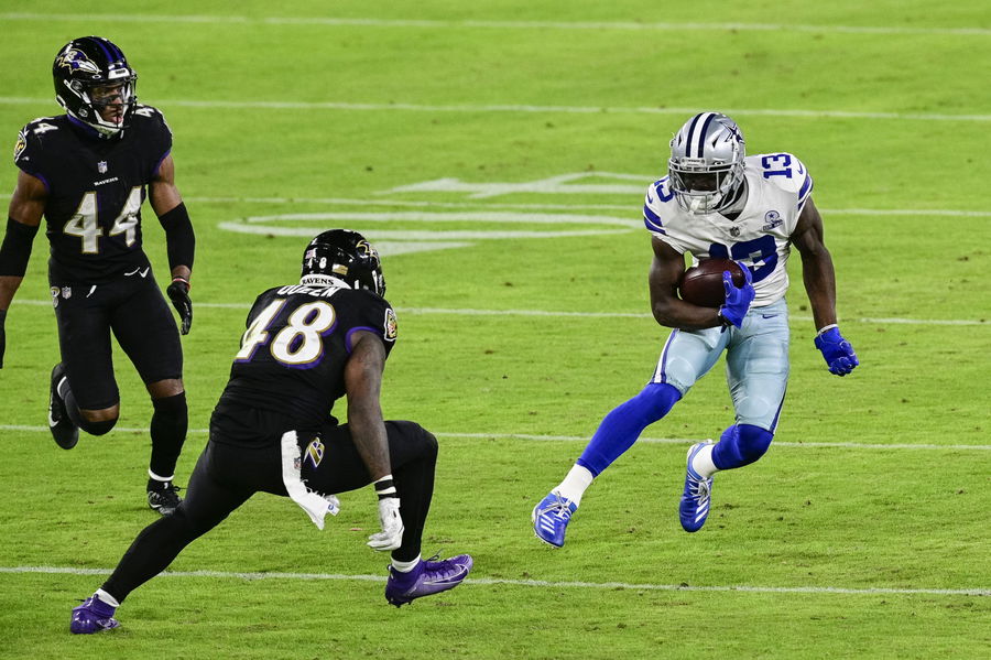 Dec 8, 2020; Baltimore, Maryland, USA; Dallas Cowboys wide receiver Michael Gallup (13) cuts as Baltimore Ravens inside linebacker Patrick Queen (48) defends during the second quarter