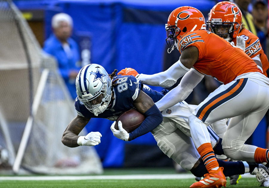 Oct 30, 2022; Arlington, Texas, USA; Dallas Cowboys wide receiver CeeDee Lamb (88) catches a pass for first down as Chicago Bears safety Eddie Jackson (4) defends during the second quarter at AT&T Stadium. Mandatory Credit: Jerome Miron-USA TODAY Sports