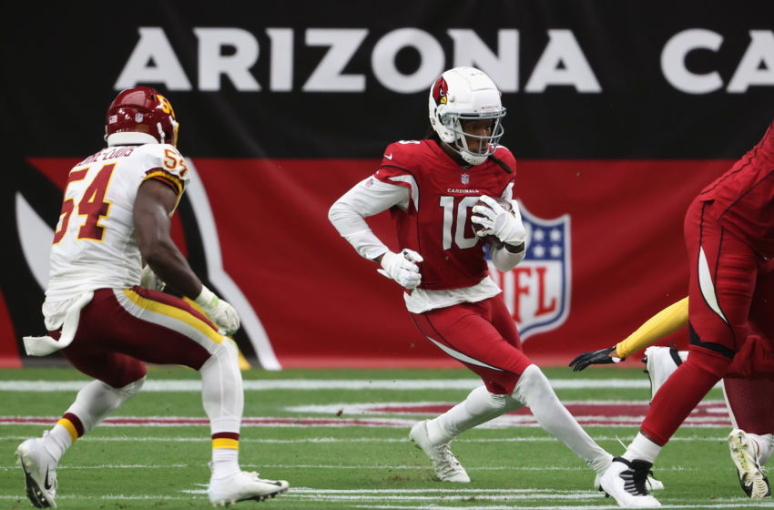 GLENDALE, ARIZONA – SEPTEMBER 20: Wide receiver DeAndre Hopkins #10 of the Arizona Cardinals runs with the football after a reception in the game against the Washington Football Team at State Farm Stadium on September 20, 2020 in Glendale, Arizona. The Cardinals defeated the Washington Football Team 30-15. (Photo by Christian Petersen/Getty Images)