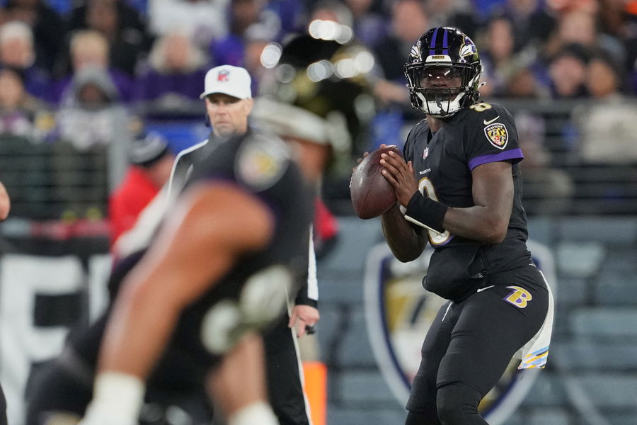 Oct 9, 2022; Baltimore, Maryland, USA; Baltimore Ravens quarterback Lamar Jackson (8) looks to pass to tight end Mark Andrews (89) in the fourth quarter against the Cincinnati Bengals at M&T Bank Stadium. Mandatory Credit: Mitch Stringer-USA TODAY Sports