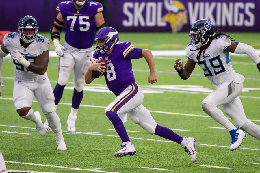 Sep 27, 2020; Minneapolis, Minnesota, USA; Minnesota Vikings quarterback Kirk Cousins (8) scrambles in the fourth quarter against the Tennessee Titans at U.S. Bank Stadium. Mandatory Credit: Brad Rempel-USA TODAY Sports