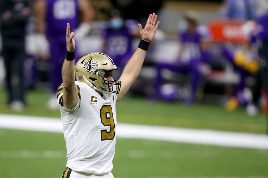 Dec 25, 2020; New Orleans, Louisiana, USA; New Orleans Saints quarterback Drew Brees (9) gestures after a touchdown run by running back Alvin Kamara (41). Mandatory Credit: Chuck Cook-USA TODAY Sports