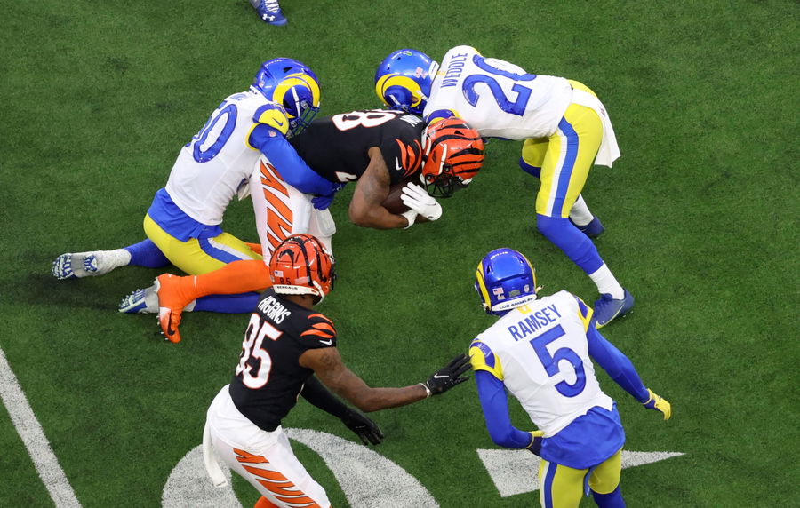 American Football – NFL – Super Bowl LVI – Cincinnati Bengals v Los Angeles Rams – SoFi Stadium, Inglewood, California, United States – February 13, 2022 Cincinnati Bengals’ Joe Mixon is tackled by Los Angeles Rams’ Ernest Jones and Eric Weddle REUTERS/Mario Anzuoni