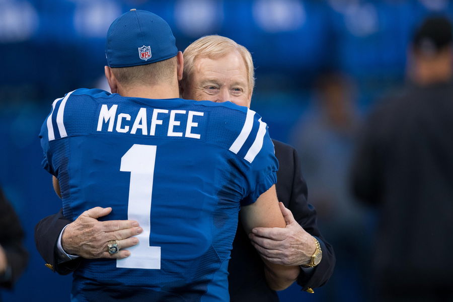 INDIANAPOLIS, IN – JANUARY 01: Indianapolis Colts punter Pat McAfee (1) hugs former general manager Bill Polian. Before the NFL game between the Jacksonville Jaguars and Indianapolis Colts. On January 1, 2017, at Lucas Oil Stadium in Indianapolis, IN. (Photo by Zach Bolinger/Icon Sportswire via Getty Images)