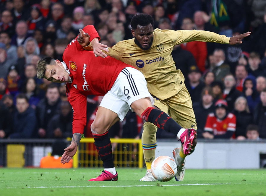 Soccer Football – Europa League – Play-Off Second Leg – Manchester United v FC Barcelona – Old Trafford, Manchester, Britain – February 23, 2023 Manchester United’s Lisandro Martinez in action with FC Barcelona’s Franck Kessie REUTERS/Carl Recine