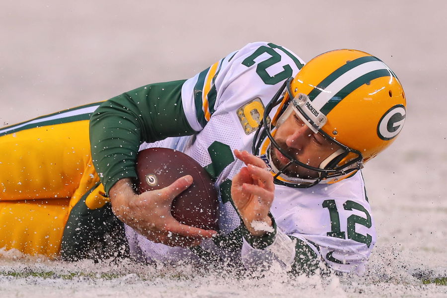 EAST RUTHERFORD, NJ – DECEMBER 01: Green Bay Packers quarterback Aaron Rodgers 12 slides in the snow during the third quarter of the National Football League game between the New York Giants and the Green Bay Packers on December 1, 2019 at MetLife Stadium in East Rutherford, NJ. Photo by Rich Graessle/Icon Sportswire NFL, American Football Herren, USA DEC 01 Packers at Giants PUBLICATIONxINxGERxSUIxAUTxHUNxRUSxSWExNORxDENxONLY Icon1912015066