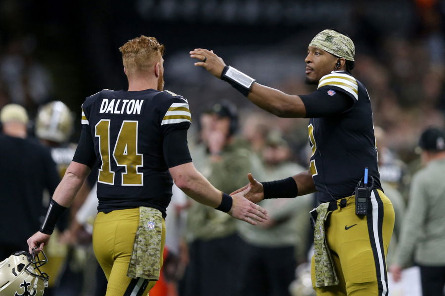 Nov 20, 2022; New Orleans, Louisiana, USA; New Orleans Saints quarterback Andy Dalton (14) is congratulated by Jameis Winston (2) as he comes off the field in the second half against the Los Angeles Rams at the Caesars Superdome. Mandatory Credit: Chuck Cook-USA TODAY Sports | Reuters