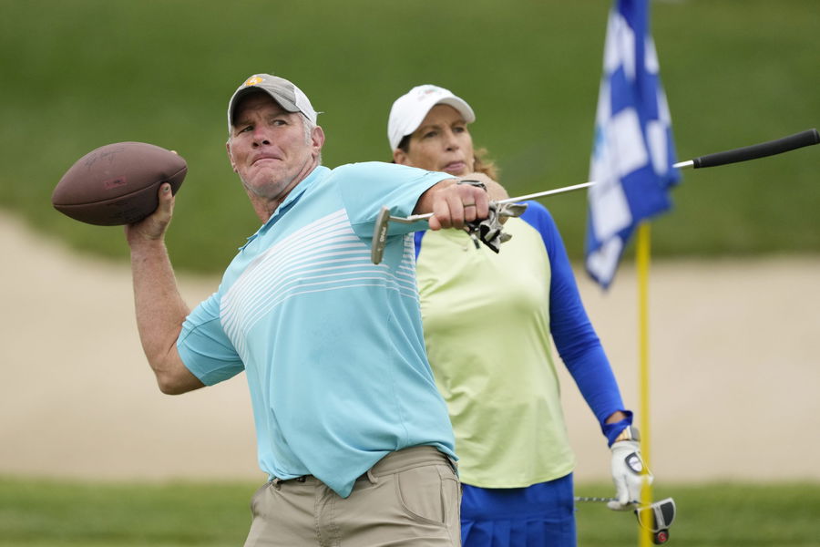 MADISON, WISCONSIN – JUNE 11: Former NFL player Brett Favre throws a football to a fan on the 14th green during the Celebrity Foursome at the second round of the American Family Insurance Championship at University Ridge Golf Club on June 11, 2022 in Madison, Wisconsin. (Photo by Patrick McDermott/Getty Images)