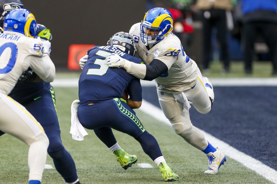 Dec 27, 2020; Seattle, Washington, USA; Los Angeles Rams defensive end Aaron Donald (99) sacks Seattle Seahawks quarterback Russell Wilson (3) during the third quarter at Lumen Field. Mandatory Credit: Joe Nicholson-USA TODAY Sports