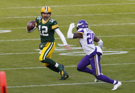 Nov 1, 2020; Green Bay, Wisconsin, USA; Green Bay Packers quarterback Aaron Rodgers (12) scrambles under pressure from Minnesota Vikings cornerback Jeff Gladney (20) during the third quarter at Lambeau Field. Mandatory Credit: Jeff Hanisch-USA TODAY Sports