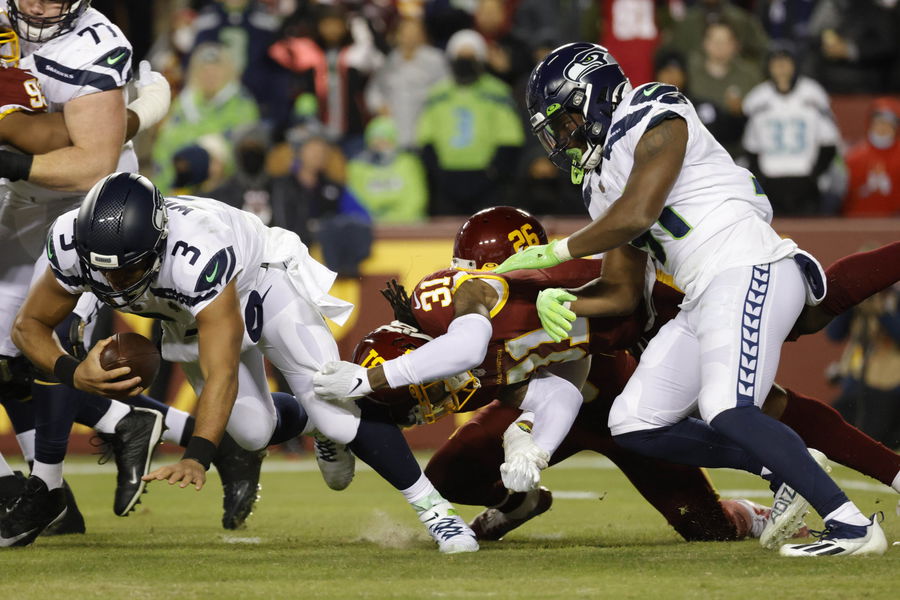 Nov 29, 2021; Landover, Maryland, USA; Seattle Seahawks quarterback Russell Wilson (3) is sacked by Washington Football Team safety Kamren Curl (31) and Washington Football Team safety Landon Collins (26) during the third quarter at FedExField. Mandatory Credit: Geoff Burke-USA TODAY Sports| Credit-Reuters