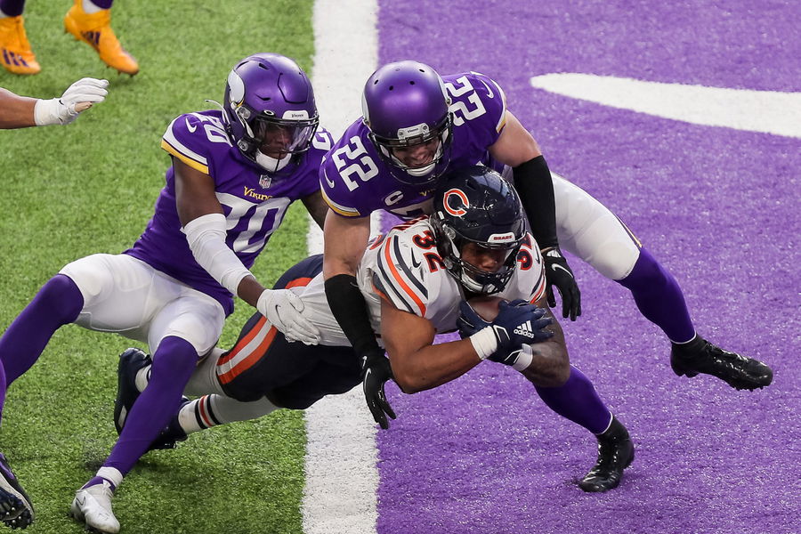 Dec 20, 2020; Minneapolis, Minnesota, USA; Chicago Bears running back David Montgomery (32) runs the ball for a touchdown in the third quarter against Minnesota Vikings defensive back Harrison Smith (22) at U.S. Bank Stadium. Mandatory Credit: Brad Rempel-USA TODAY Sports