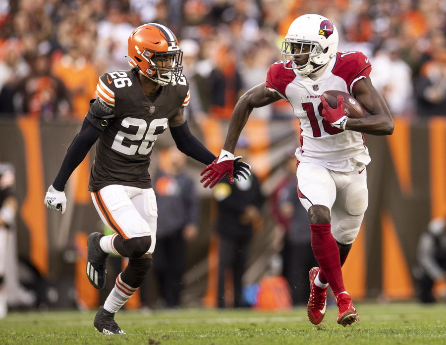 Oct 17, 2021; Cleveland, Ohio, USA; Arizona Cardinals wide receiver A.J. Green (18) runs the ball as Cleveland Browns cornerback Greedy Williams (26) pursues him during the third quarter at FirstEnergy Stadium. Mandatory Credit: Scott Galvin-USA TODAY Sports