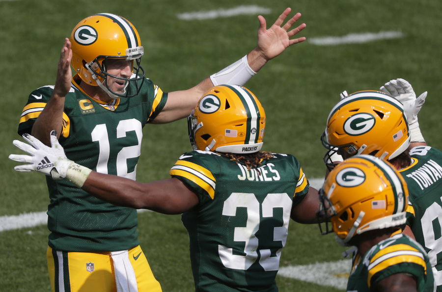 Sep 20, 2020; Green Bay, WI, USA; Green Bay Packers quarterback Aaron Rodgers running back Aaron Jones celebrate following an early third quarter touchdown against the Detroit Lions on Sunday, September 20, 2020, at Lambeau Field in Green Bay, Wis. Mandatory Credit: William Glasheen/Appleton Post-Crescsent-USA TODAY NETWORK