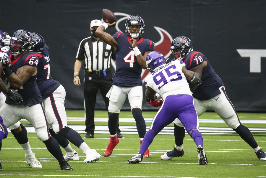 Oct 4, 2020; Houston, Texas, USA; Houston Texans quarterback Deshaun Watson (4) throws a pass against the Minnesota Vikings during the first quarter at NRG Stadium. Mandatory Credit: Troy Taormina-USA TODAY Sports
