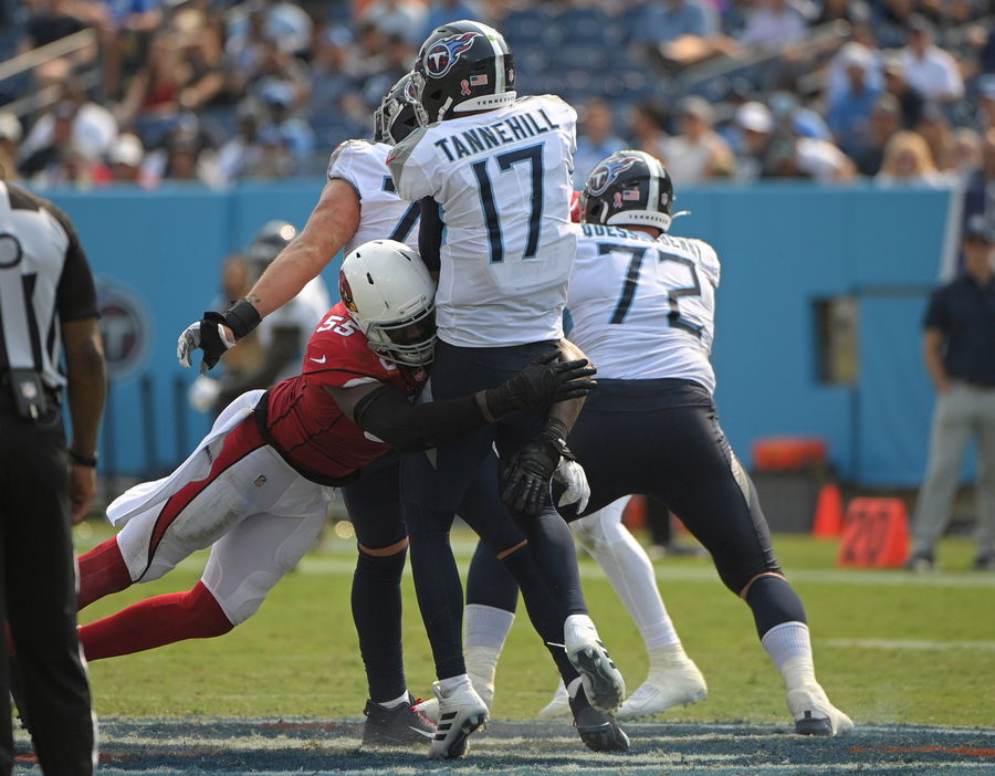 Sep 12, 2021; Nashville, TN, USA; Tennessee Titans quarterback Ryan Tannehill (17) is sacked by Arizona Cardinals linebacker Chandler Jones (55) during the third quarter at Nissan Stadium Sunday, Sept. 12, 2021 in Nashville, Tenn. Mandatory Credit: Mandatory Credit: Andrew Nelles-USA TODAY Sports