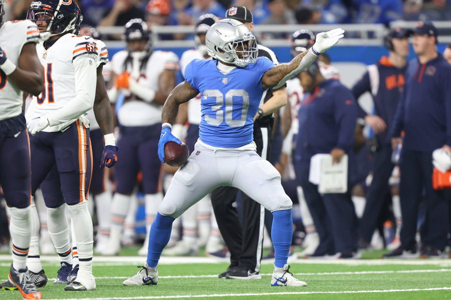 Detroit Lions vs Chicago Bears Detroit Lions running back Jamaal Williams 30 reacts after a play during the first half of an NFL, American Football Herren, USA football game against the Chicago Bears in Detroit, Michigan USA, on Sunday, January 1, 2023 Detroit Michigan United States PUBLICATIONxNOTxINxFRA Copyright: xJorgexLemusx originalFilename:lemus-detroitl230101_npxlD.jpg
