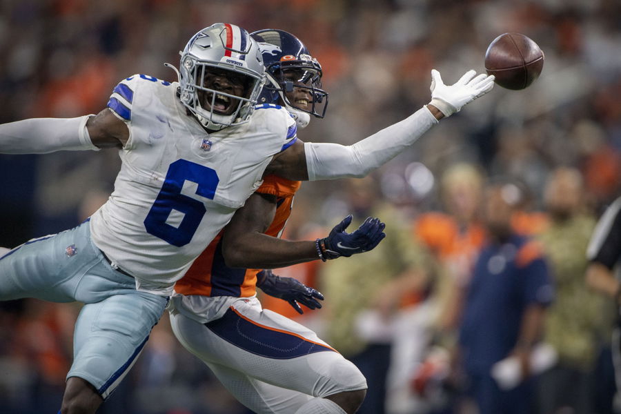 Nov 7, 2021; Arlington, Texas, USA; Dallas Cowboys safety Donovan Wilson (6) breaks up a pass intended for Denver Broncos wide receiver Jerry Jeudy (10) during the second half at AT&T Stadium. Mandatory Credit: Jerome Miron-USA TODAY Sports