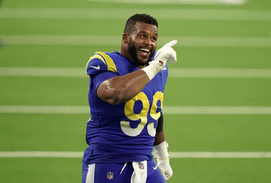 Aug 22, 2020; Inglewood California, USA; Los Angeles Rams defensive lineman Aaron Donald (99) celebrates during a scrimmage at SoFi Stadium. Mandatory Credit: Kirby Lee-USA TODAY Sports