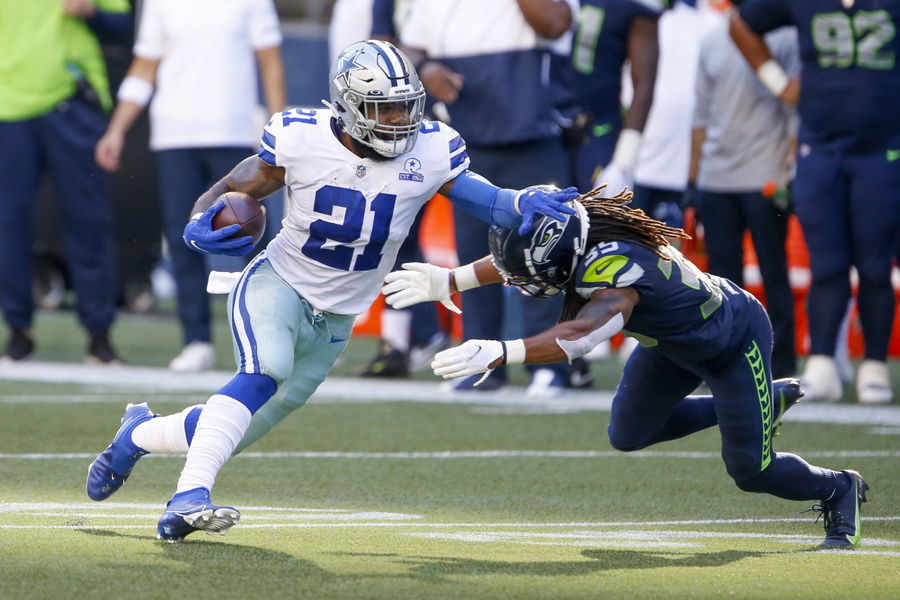 Sep 27, 2020; Seattle, Washington, USA; Dallas Cowboys running back Ezekiel Elliott (21) runs for yards after the catch as Seattle Seahawks cornerback Ryan Neal (35) closes in for a tackle during the fourth quarter at CenturyLink Field. Mandatory Credit: Joe Nicholson-USA TODAY Sports