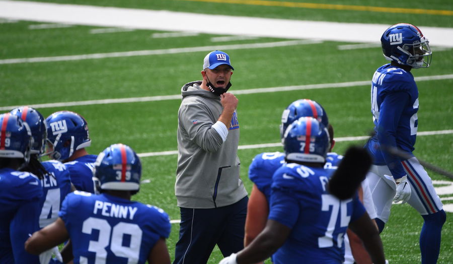 Sep 27, 2020; East Rutherford, New Jersey, USA; New York Giants head coach Joe Judge shouts out to his team against the San Francisco 49ers. Mandatory Credit: Robert Deutsch-USA TODAY Sports