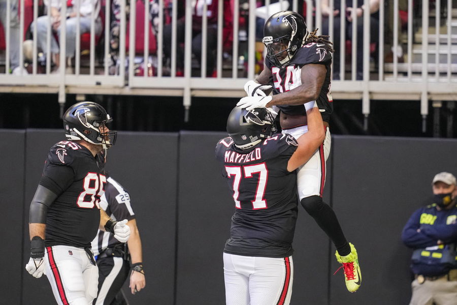 Dec 26, 2021; Atlanta, Georgia, USA; Atlanta Falcons running back Cordarrelle Patterson (84) reacts with guard Jalen Mayfield (77) after scoring a touchdown against the Detroit Lions during the first half at Mercedes-Benz Stadium. Mandatory Credit: Dale Zanine-USA TODAY Sports