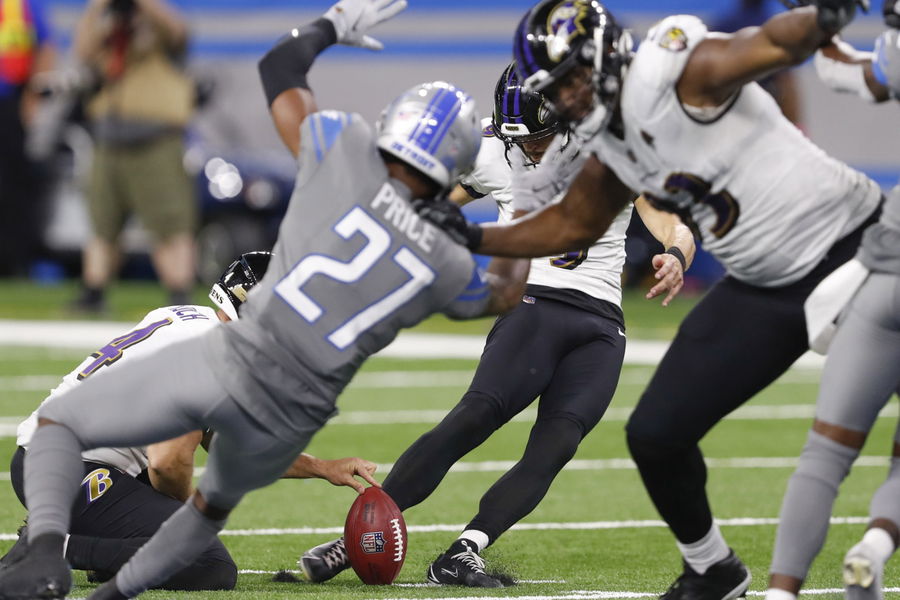 Sep 26, 2021; Detroit, Michigan, USA; Baltimore Ravens kicker Justin Tucker (9) kicks a 66 yard field goal to win the game as time expires in the fourth quarter against the Detroit Lions at Ford Field. Mandatory Credit: Raj Mehta-USA TODAY Sports