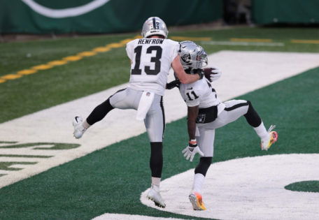 Dec 6, 2020; East Rutherford, NJ, USA; Las Vegas Raiders wide receiver Henry Ruggs III (11) celebrates with wide receiver Hunter Renfrow (13) after scoring a touchdown against the New York Jets in the fourth quarter of a NFL game at MetLife Stadium. Mandatory Credit: Vincent Carchietta-USA TODAY Sports