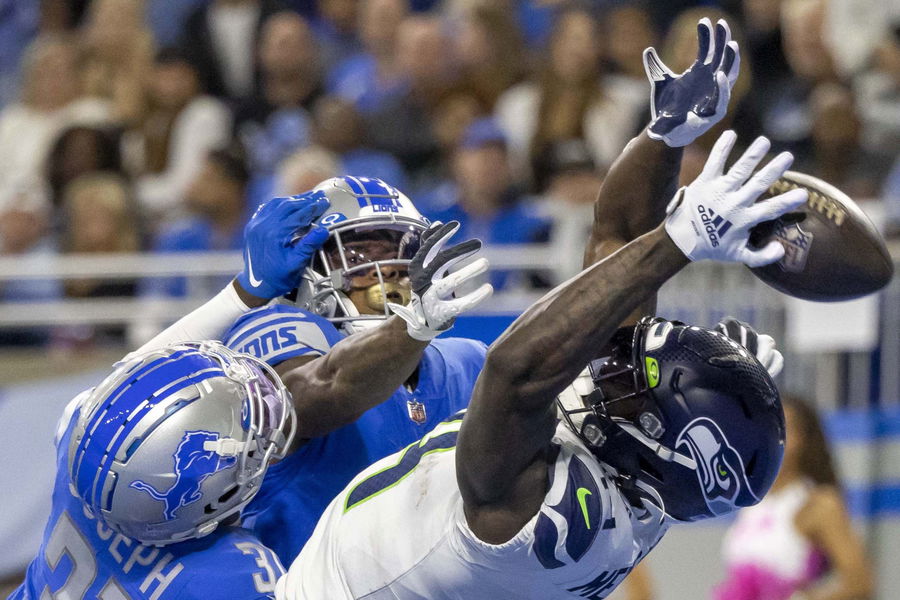 Oct 2, 2022; Detroit, Michigan, USA; Seattle Seahawks wide receiver DK Metcalf (14) is unable to make a catch in the end zone as Detroit Lions safety Kerby Joseph (31) defends during the third quarter at Ford Field. Mandatory Credit: David Reginek-USA TODAY Sports