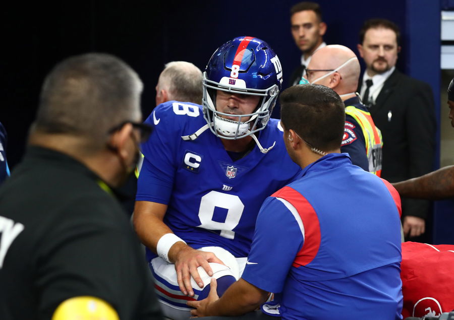 Oct 10, 2021; Arlington, Texas, USA; New York Giants quarterback Daniel Jones (8) heads to the locker room on a medical cart in the first half during the game against the Dallas Cowboys at AT&T Stadium. Mandatory Credit: Matthew Emmons-USA TODAY Sports