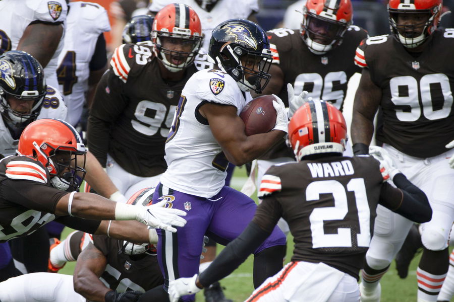 Sep 13, 2020; Baltimore, Maryland, USA; Baltimore Ravens running back J.K. Dobbins (27) runs the ball against Cleveland Browns at M&T Bank Stadium. Mandatory Credit: Leah Stauffer-USA TODAY Sports