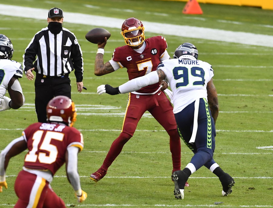 Dec 20, 2020; Landover, Maryland, USA; Washington Football Team quarterback Dwayne Haskins Jr. (7) attempts a pass as Seattle Seahawks defensive end Damontre’ Moore (99) defends during the second half at FedExField. Mandatory Credit: Brad Mills-USA TODAY Sports