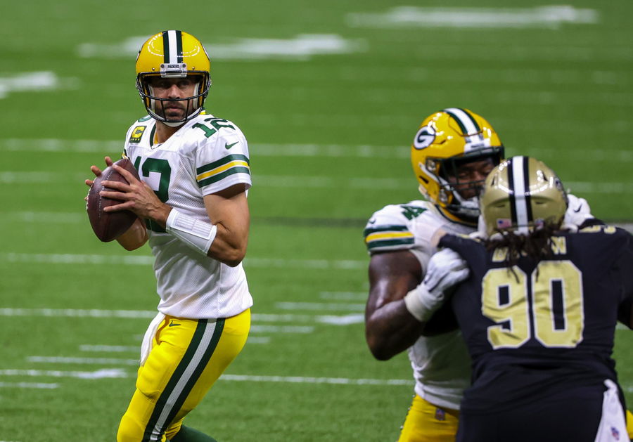 Sep 27, 2020; New Orleans, Louisiana, USA; Green Bay Packers quarterback Aaron Rodgers (12) looks to pass against the New Orleans Saints during the second quarter at the Mercedes-Benz Superdome. Mandatory Credit: Derick E. Hingle-USA TODAY Sports