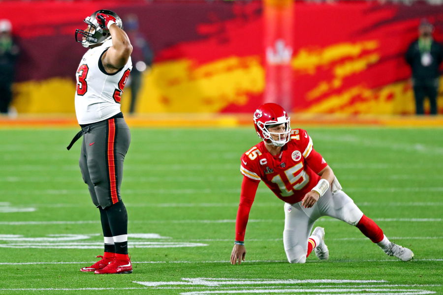 Feb 7, 2021; Tampa, FL, USA; Tampa Bay Buccaneers defensive end Ndamukong Suh (93) reacts after a play against Kansas City Chiefs quarterback Patrick Mahomes (15) during the third quarter in Super Bowl LV at Raymond James Stadium. Mandatory Credit: Mark J. Rebilas-USA TODAY Sports