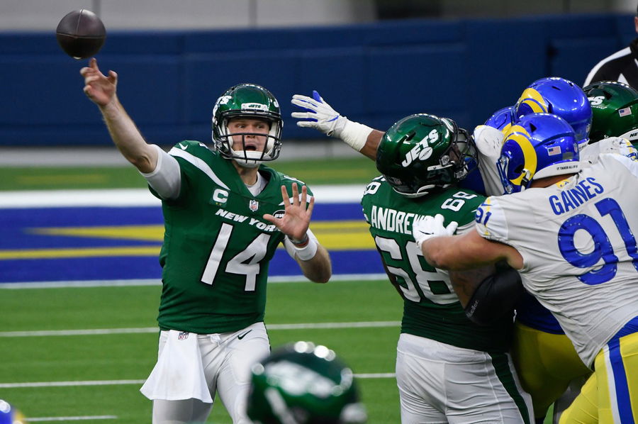 Dec 20, 2020; Inglewood, California, USA; New York Jets quarterback Sam Darnold (14) throws a pass during the third quarter against the Los Angeles Rams at SoFi Stadium. Mandatory Credit: Robert Hanashiro-USA TODAY Sports