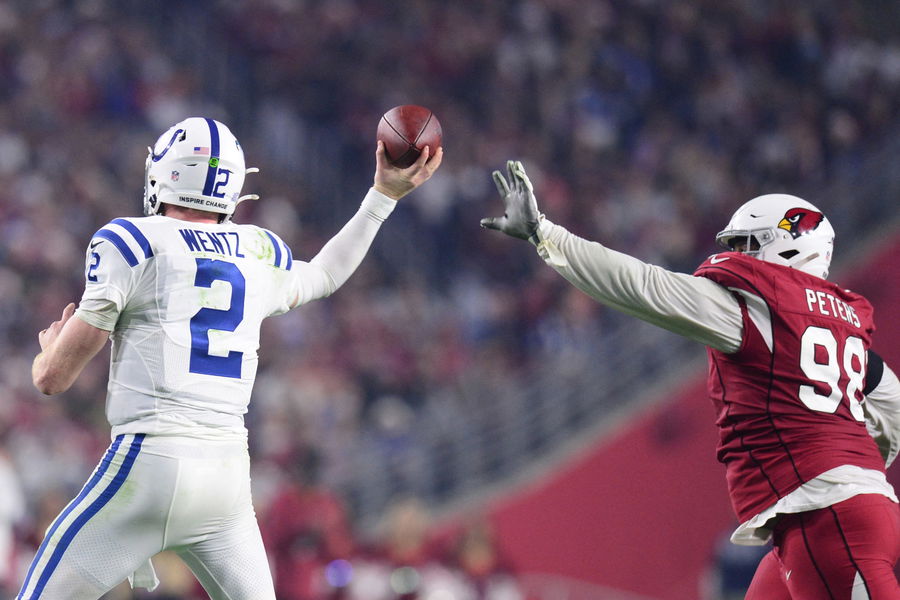 Dec 25, 2021; Glendale, Arizona, USA; Arizona Cardinals defensive tackle Corey Peters (98) pursues Indianapolis Colts quarterback Carson Wentz (2) during the second half at State Farm Stadium. Mandatory Credit: Joe Camporeale-USA TODAY Sports
