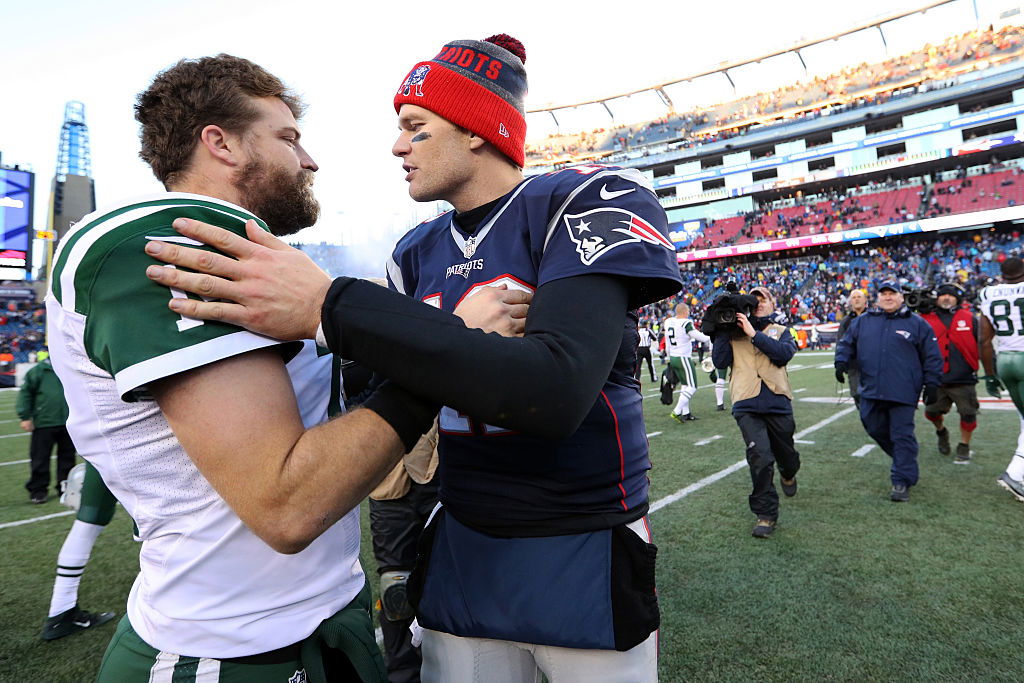 FOXBORO, MA – DECEMBER 24: Tom Brady #12 of the New England Patriots talks with Ryan Fitzpatrick #14 of the New York Jets after the Patriots defeat the Jets 41-3 at Gillette Stadium on December 24, 2016 in Foxboro, Massachusetts. (Photo by Maddie Meyer/Getty Images)