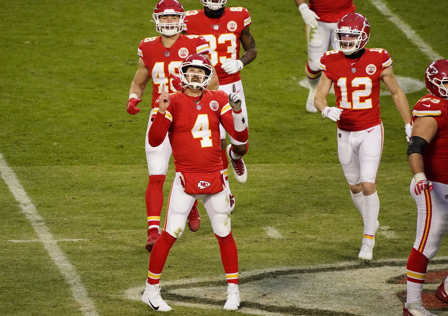 Jan 17, 2021; Kansas City, Missouri, USA; Kansas City Chiefs quarterback Chad Henne (4) celebrates the victory against the Cleveland Browns in the AFC Divisional Round playoff game at Arrowhead Stadium. Mandatory Credit: Jay Biggerstaff-USA TODAY Sports