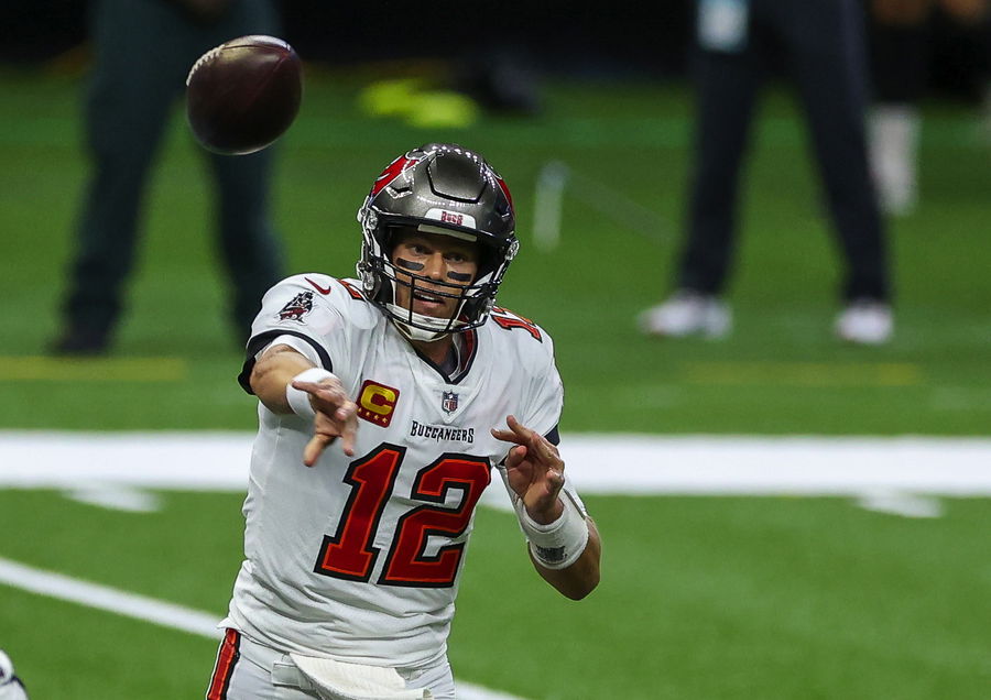 Sep 13, 2020; New Orleans, Louisiana, USA; Tampa Bay Buccaneers quarterback Tom Brady (12) throws against the New Orleans Saints during the first quarter at the Mercedes-Benz Superdome. Mandatory Credit: Derick E. Hingle-USA TODAY Sports