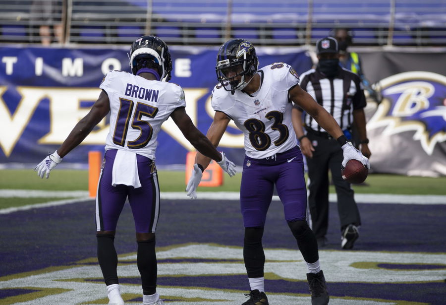 Sep 13, 2020; Baltimore, Maryland, USA; Baltimore Ravens wide receiver Willie Snead IV (83) celebrates a touchdown with Baltimore Ravens wide receiver Marquise Brown (15) against Cleveland Browns during the 3rd quarter at M&T Bank Stadium. Mandatory Credit: Leah Stauffer-USA TODAY Sports