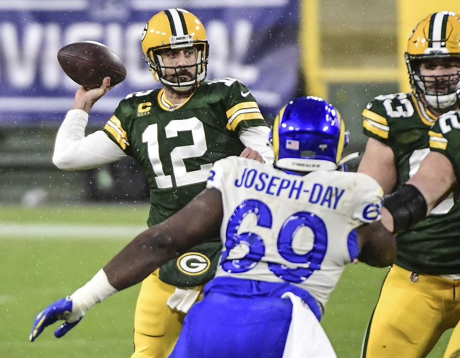 Jan 16, 2021; Green Bay, Wisconsin, USA; Green Bay Packers quarterback Aaron Rodgers (12) looks to pass in the first quarter during the game against the Los Angeles Rams at Lambeau Field. Mandatory Credit: Benny Sieu-USA TODAY Sports