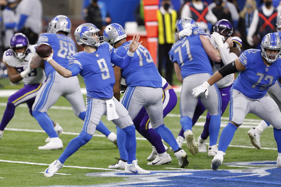 Jan 3, 2021; Detroit, Michigan, USA; Detroit Lions quarterback Matthew Stafford (9) drops back to pass during the first quarter against the Minnesota Vikings at Ford Field. Mandatory Credit: Raj Mehta-USA TODAY Sports