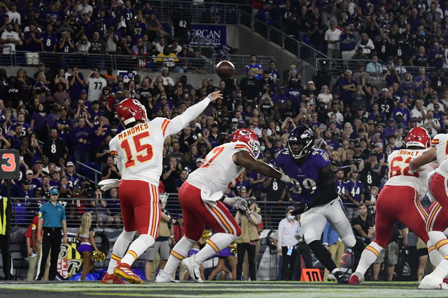 Sep 19, 2021; Baltimore, Maryland, USA; Kansas City Chiefs quarterback Patrick Mahomes (15) throws from the end zone during the first half against the Baltimore Ravens at M&T Bank Stadium. Mandatory Credit: Tommy Gilligan-USA TODAY Sports