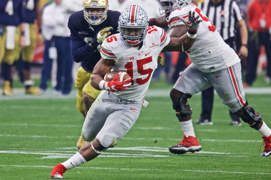 Jan. 1, 2016 – Glendale, Arizona, U.S – Ohio State Buckeyes running back Ezekiel Elliott (15) carries the ball in the second quarter of the game between the Notre Dame Fighting Irish and the Ohio State Buckeyes at University of Phoenix Stadium, Glendale, Arizona. NCAA College League USA Football 2015 – Battlefrogs Fiesta Bowl – ZUMAs304